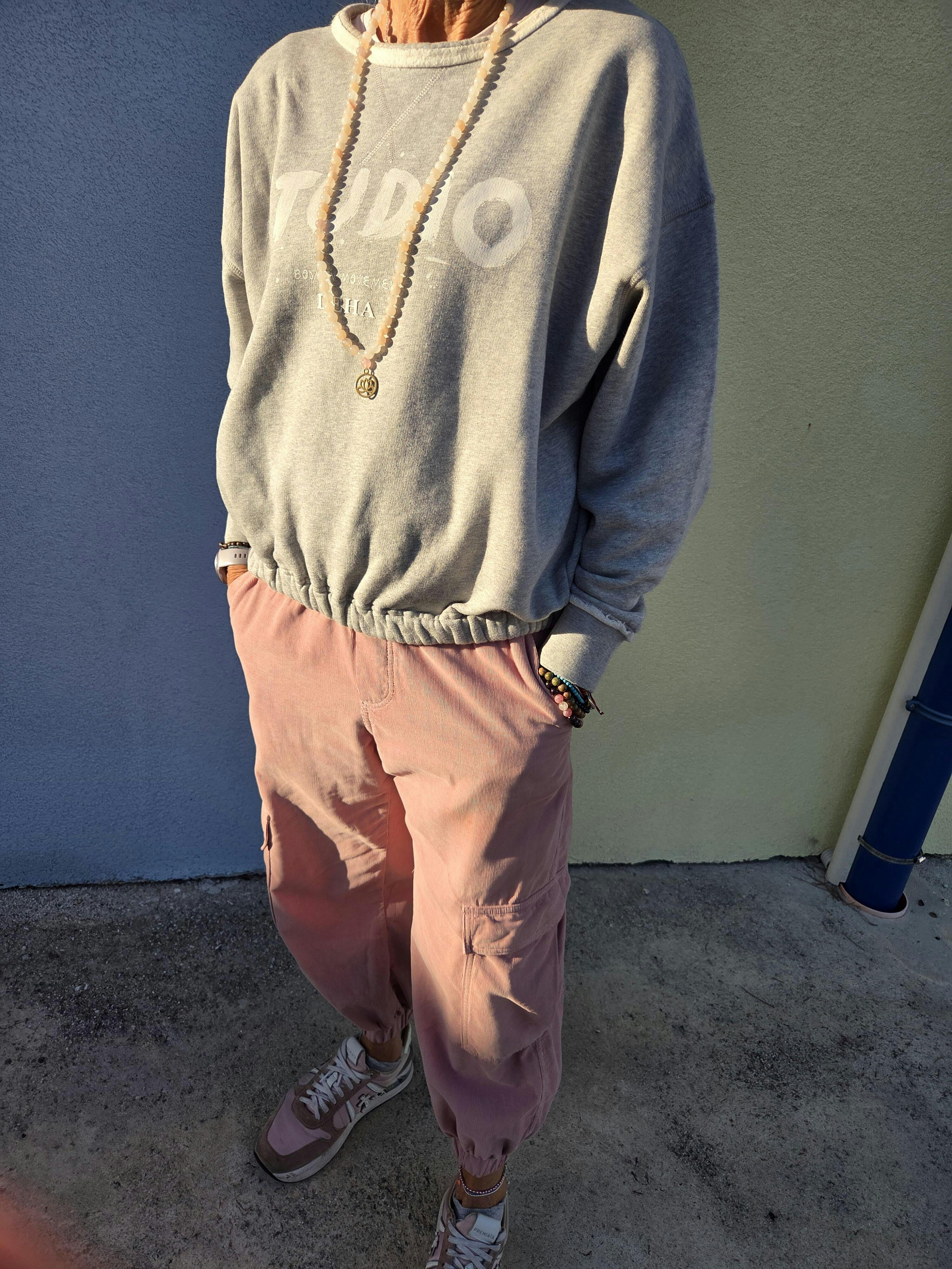 • Girocollo con bordo a taglio vivo, polsini in costina, fondo elasticizzato basso